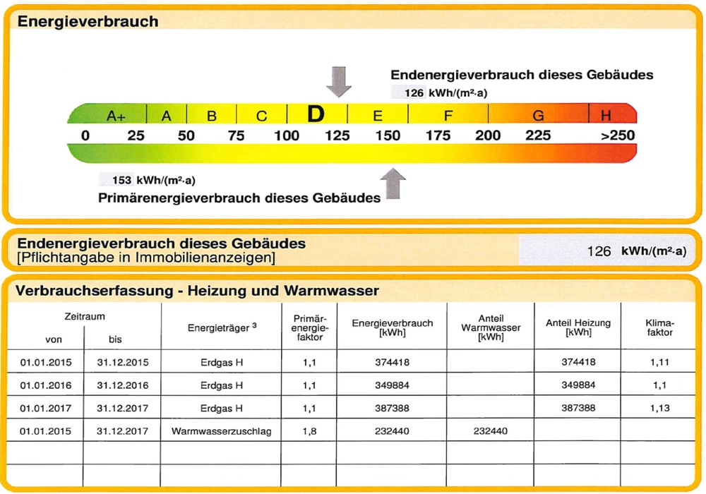 Die Beheizung der Wohnungen erfolgt über eine Gas-Zentralheizung. Der vorliegende Energieausweis weist einen Energieverbrauchswert von 126,00 kWh/(m²a) aus.
