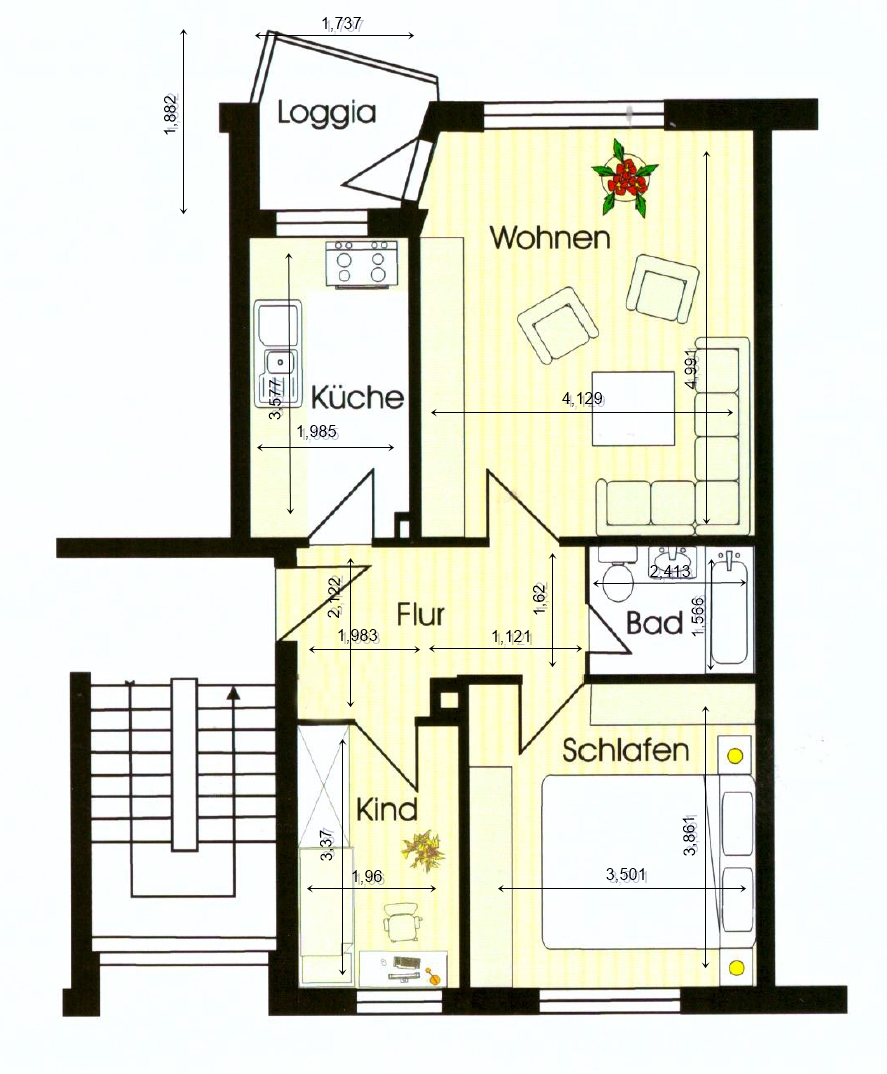 Die moderne 3 Zimmer Eigentumswohnung mit einer Wohnfläche von ca. 57,11m² befindet sich im 2. Obergeschoss eines gepflegten Mehrfamilienhauses. Das Gebäude wurde 1966 in massiver Bauweise mit roter Klinkerfassade erbaut. Folgende Modernisierungen wurden seit Erstellung ausgeführt: Aufstockung des Daches mit wohnlichem Ausbau und Dämmung (2004), Erneuerung der Haustüren (2006), Erneuerung der Gas-Zentralheizung (2009). Die Eigentümergemeinschaft besteht aus 105 Wohneinheiten verteilt auf 9 Hauseingänge (WEG Pflugacker 13a -17c).