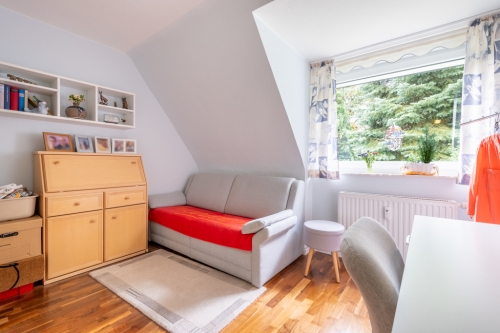 - Doppelverglaste Kunststofffenster (Gauben straßenseitig), dreifachverglaste Holzfenster (giebelseitig und Küchenbereich)