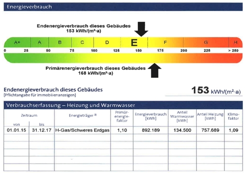 Die Beheizung und Warmwasseraufbereitung des Hauses erfolgt über eine Gasheizung (Bj´18). Der vorliegende Energieausweis weist einen Energieverbrauchswert von 153 kWh/(m²a) aus.