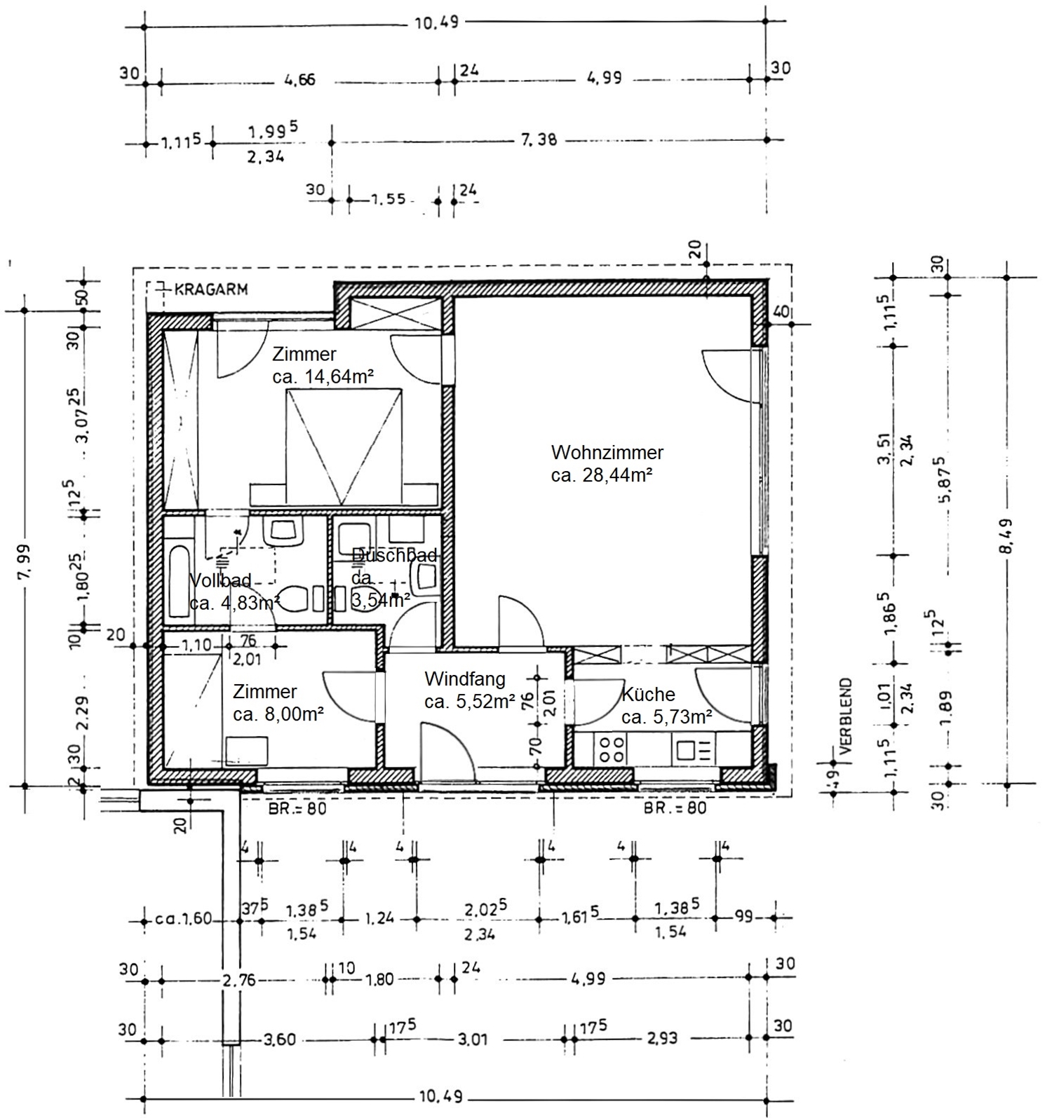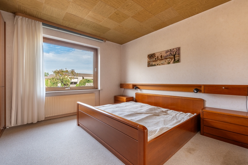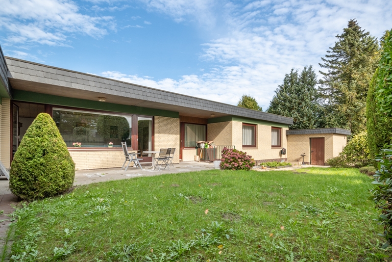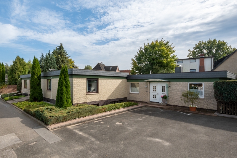 Der vollunterkellerte 4 Zimmer Bungalow mit einer Wohnfläche von ca. 120,48m² wurde 1972 (Baugenehmigung Nr. 12b/623/72 von 1972) errichtet. Laut Baubeschreibung wurden die ca. 32-38,5cm starken Außenwände mit ca. 11,5cm Vormauerziegel (Verblend), ca. 2cm kaschierte Hartschaumplatten, ca. 1cm Isolierputz, ca. 17,5cm bzw. ca. 24cm Kalksandstein (KSL 1,4/150/II) errichtet. Die Innenwände (tragende = ca. 24cm, nicht tragende = ca. 11,5cm) und das Kellermauerwerk (ca. 36,5cm, 1,8/150/III) bestehen aus Kalksandsteinen. Das aufgehende Mauerwerk ist durch waagerechte Speerschicht aus Bitumenpappe gegen Feuchtigkeit geschützt. Für eine Reduzierung des auf dem Gebäude lastenden Wasserdrucks sorgt das Drainagesystem. Das Untergeschoss mit einer Raumhöhe von ca. 2,20m bietet auf einer Nutzfläche von ca. 120,48m² (identisch dem Erdgeschoss) verteilt auf drei große Hobby-/Abstell-/Kellerräume mit Lichteinfall durch großzügige Abböschungen, ein WC, einen Heizungsraum sowie den Öltankraum. Das Flachdach wurde dem Baujahr entsprechend (nach DIN) mit 3 Lagen Bitumpappe, ca. 5cm Styrodur, Dampfsperre, ca. 24cm Rauspund, Holzbalken, Sparschalung und Holz bzw. Putzdecken erstellt. Eine Vielzahl von doppelverglasten Holzfenstern lassen die Räume im Tageslicht erstrahlen.