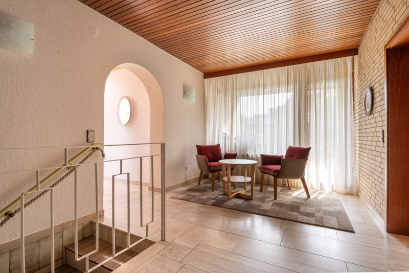 Das Flachdach wurde dem Baujahr entsprechend (nach DIN) mit ca. 20cm Ytong-Dachplatten mit 3 Lagen Bitumpappe mit Dampfsperre erstellt. Eine Vielzahl von doppelverglasten Holzfenstern lassen die Räume im Tageslicht erstrahlen.