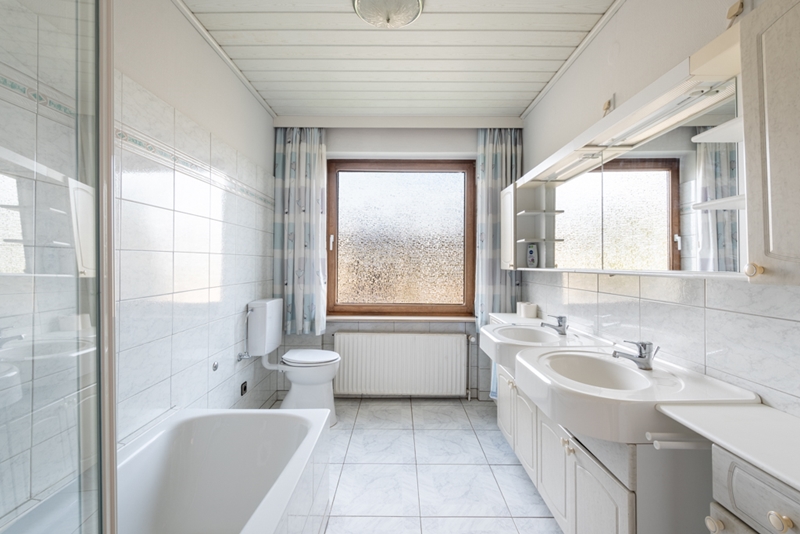 - Weißes Tageslichtbad mit Badewanne, separater Dusche mit Echtglasduschabtrennung und Doppelwaschtisch