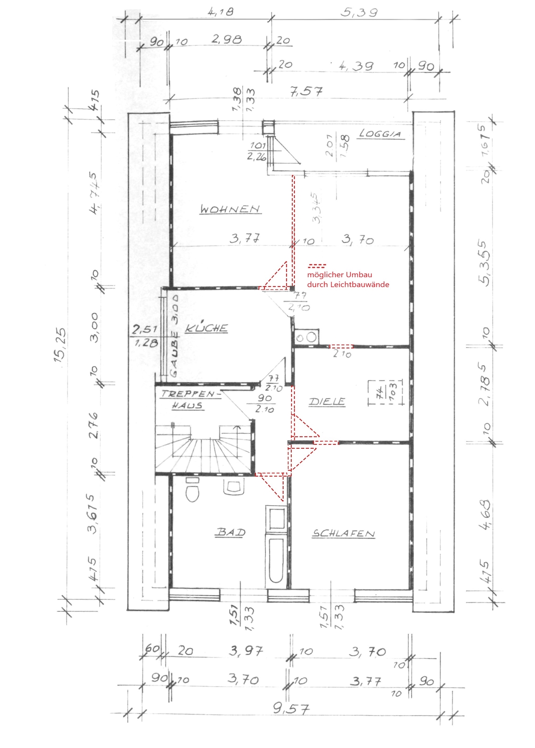 Durch wenig Aufwand (Leichtbauweise) ist es möglich, dass Obergeschoss von 3 auf 4 Zimmer zu erweitern (siehe Grundriss).