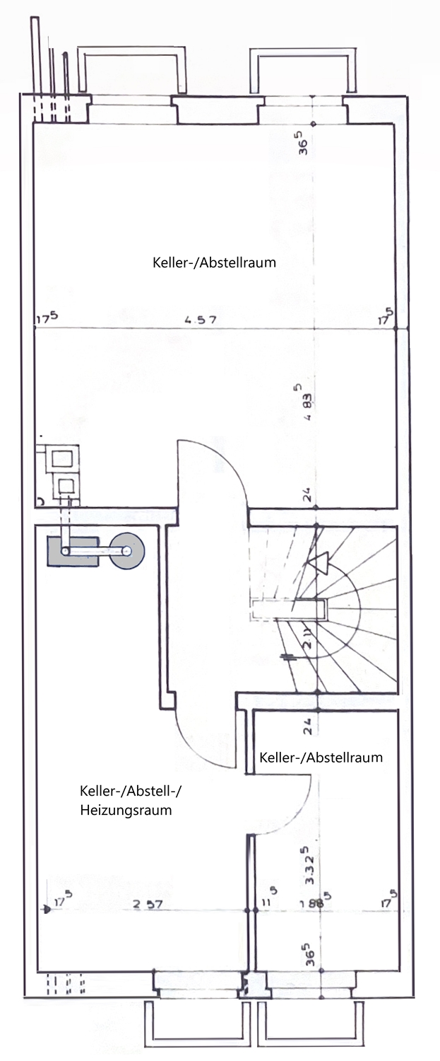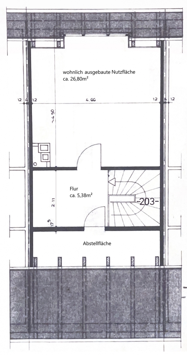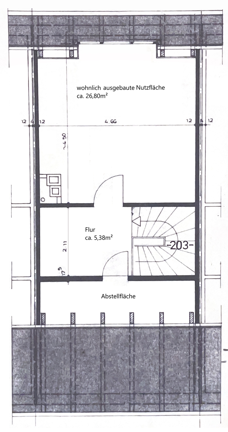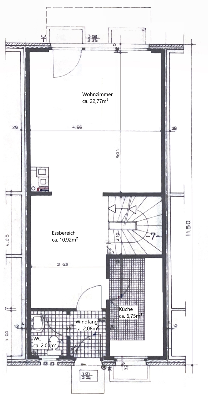 Die Wohn-/Nutzfläche verteilt sich auf ca. 45,39m² Wohnfläche im Erdgeschoss, ca. 46,70m² Wohnfläche im Obergeschoss und ca. 5,83m² Wohnfläche im Dachstudio. Des Weiteren verfügt die Immobilie über eine wohnlich ausgebaute Nutzfläche (1 Zimmer) von ca. 26,80m² im Dachstudio. In einigen Häuser in der Nachbarschaft wurde die Umwandlung der Nutzfläche im Dachstudio in Wohnfläche bereits vollzogen.