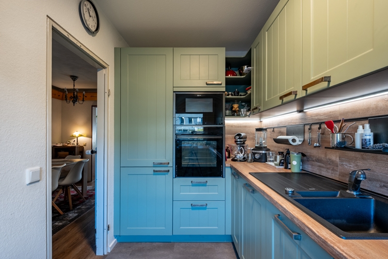 - Ansprechende und moderne Einbauküche im Landhausstil mit Backofen, Induktionskochfeld, Mikrowelle, Geschirrspülmaschine, Kühlschrank, Gefrierschrank, Unter- und Oberschränke