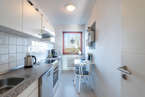 - Weiße Einbauküche mit Backofen, Cerankochfeld sowie Unter- und Oberschränke