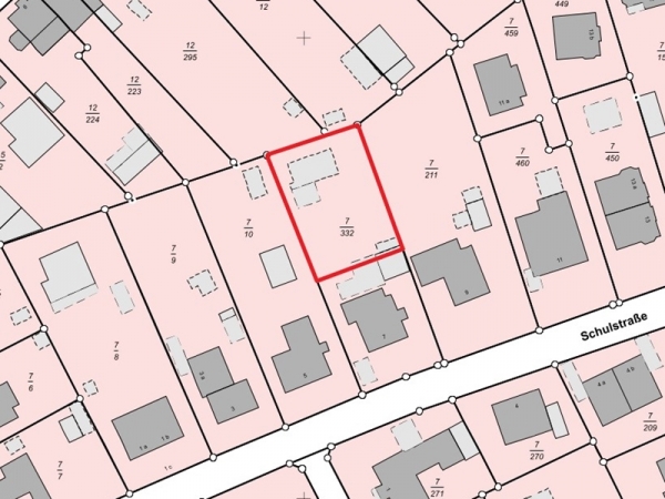 Bei dem Grundstück im Pfeifenstil (siehe Flurkarte rot markiert) handelt es sich um ein noch zu vermessendes Trenngrundstück in der Größe von ca. 500m².