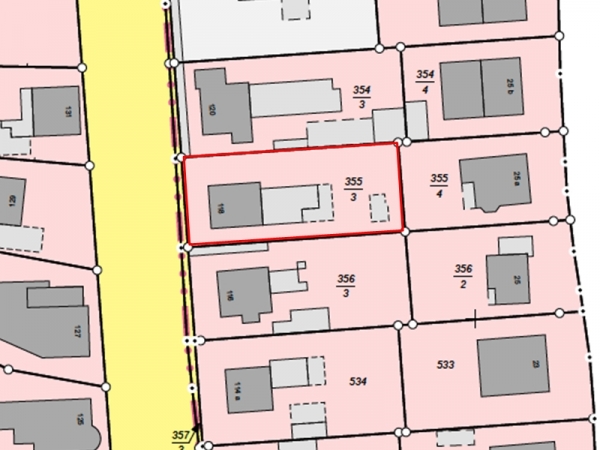 Bei dem Baugrundstück (Flurstück 355/3, siehe Flurkarte rot markiert) handelt es sich um ein 555m² Grundstück mit rechteckigem Zuschnitt.