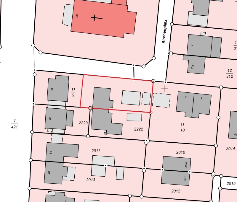 Bei dem Grundstück (siehe Flurkarte rot markiert) handelt es sich um ein noch zu vermessendes Trenngrundstück in der Größe von ca. 435m².