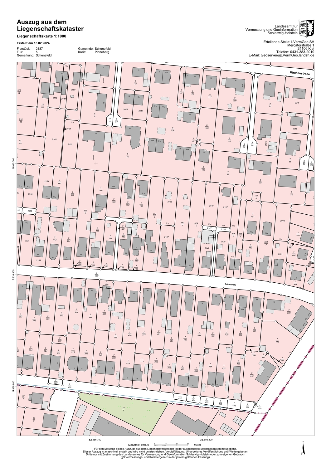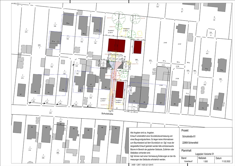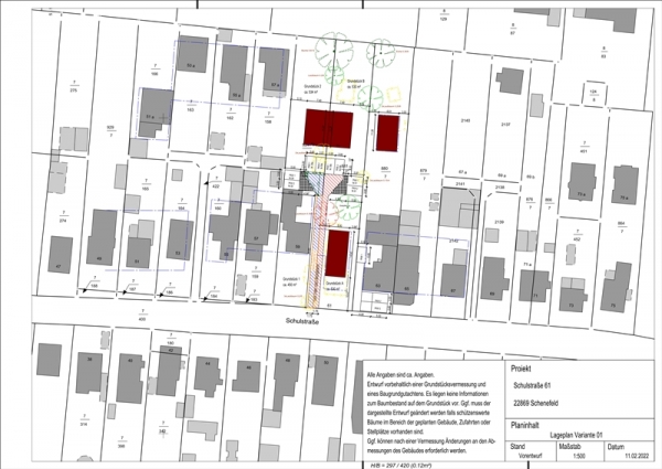 Ein durch den Kreis Pinneberg (Aktenzeichen: 43/522/VO/174.070) positiv verabschiedeter Bauvorbescheid vom 18.10.2021 liegt bereits vor. Das Baufenster verläuft über zwei Flurstücke (2186 und 924/7), sodass der Bauvorbescheid mit einer Doppelhausbebauung der Flurstücke 2186 und der hintere Grundstücksteil des Flurstückes 924/7 eingereicht wurde.
