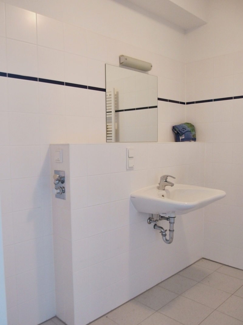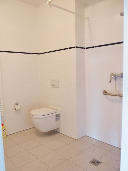 - Barrierefreies, weißes Duschbad mit Waschmaschinenanschluss