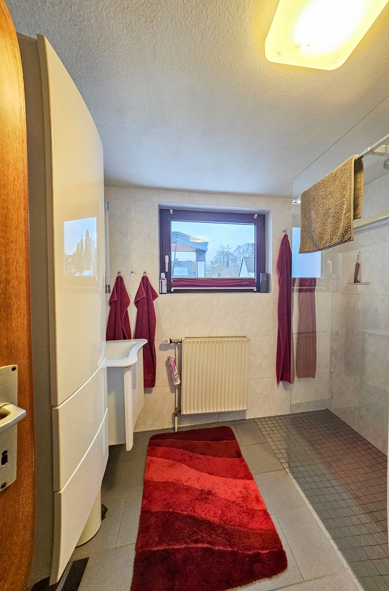 - Helles Tageslichtbad mit ebenerdiger Dusche, Echtglas-Duschabtrennung, Waschmaschinenanschluss