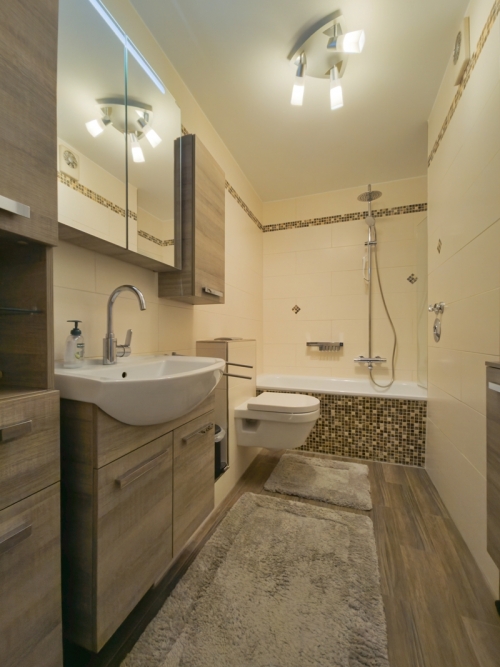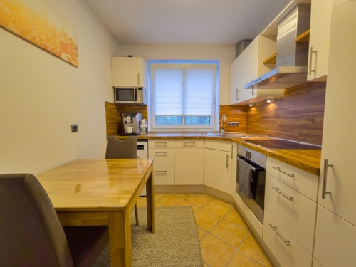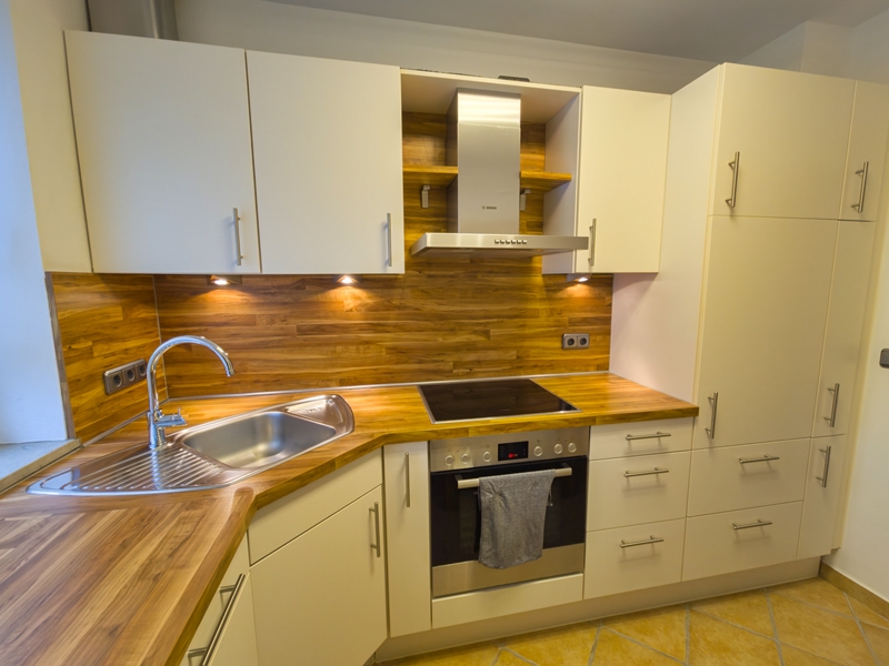 - Ansprechende Einbauküche mit Backofen, Cerankochfeld, Kühlschrank, Stellplatz für die Wasch- oder Geschirrspülmaschine, Unter- und Oberschränke